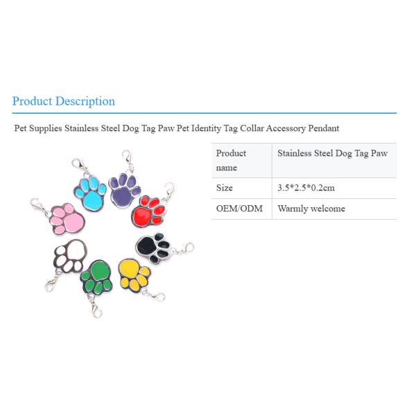 This stainless steel pet tags is crafted from zinc alloy for durability and durability, while remaining lightweight at 9g. The unique paw design is playful and evokes an animal theme, while the silver plating creates a simple and elegant look. The mixed colors add a touch of flair, making it an easy, eye-catching addition to your pet's collar.